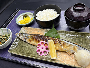 塩おにぎり・しめ鯖・焼きナス・小鉢・香物・味噌汁付